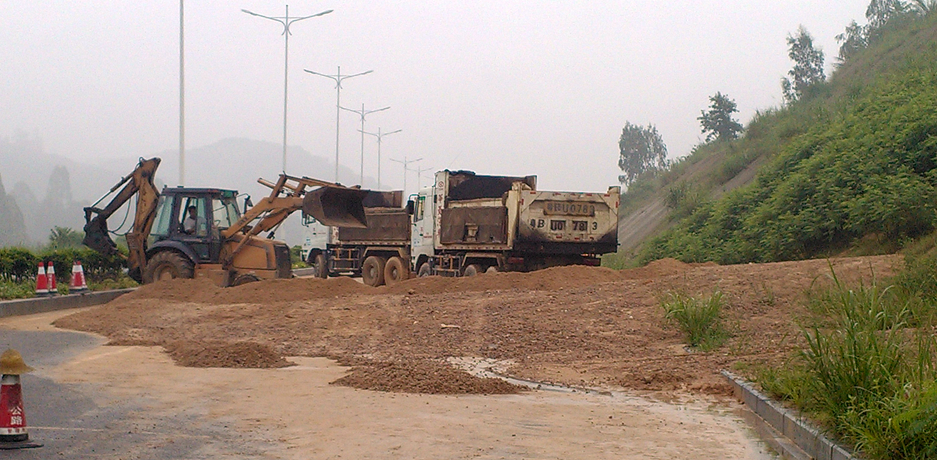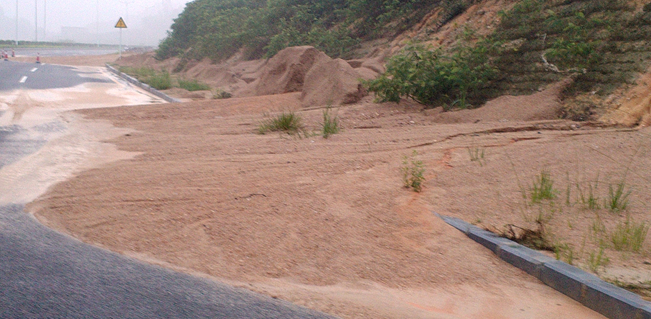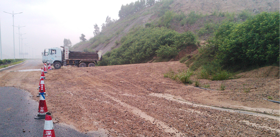 2015年5月24日凌晨2时,受“5.23”连续特大暴雨的影响下,深圳市龙岗区龙岗街道丹梓西路坪山高铁站东侧500米处,三处路堑边坡发生局部坍塌,坍塌土体堆积路面和排水沟,局部交通中断。险情发生后,我司领导高度重视,立即启动应急抢险预案,采取相应措施封锁交通,设置警戒线、禁止车辆通行,并安排相关抢险人员进行临时排险,及时清理边坡坍塌土体,上午8时成功抢通三条行车道开放了交通,保障了坪山高铁站周边道路设施的正常运行。